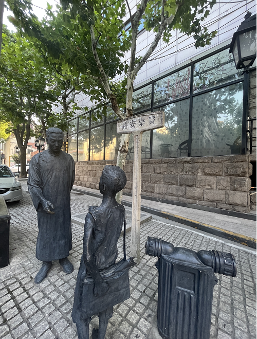 在这条街上每走几步就会看到雕塑。比如牌坊下面就是叶圣陶俯身与小报童对话的雕塑,有茅盾等一些名人雕塑