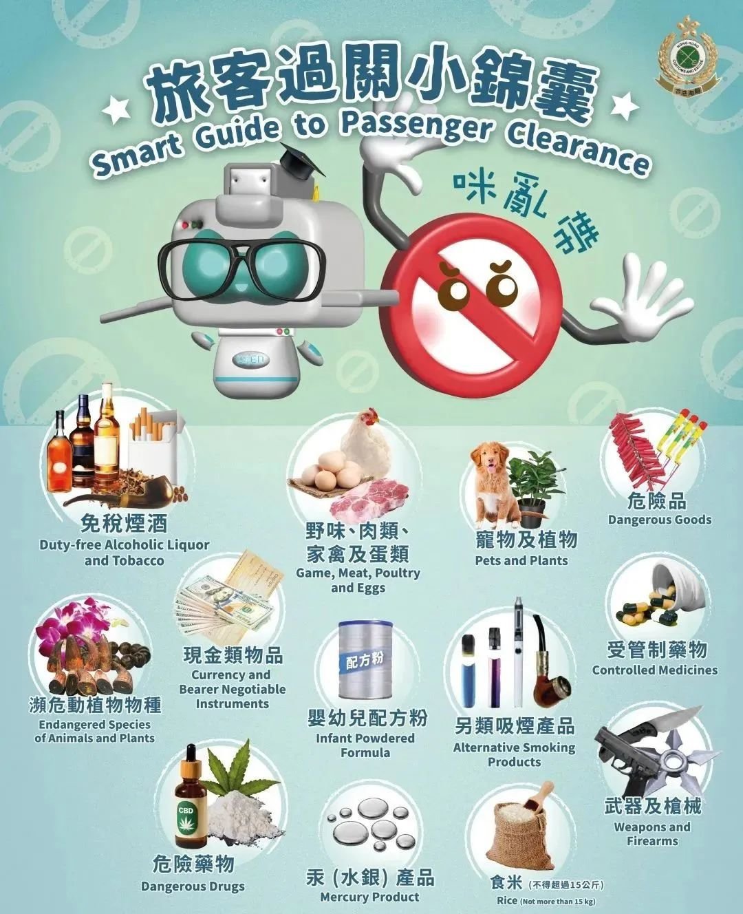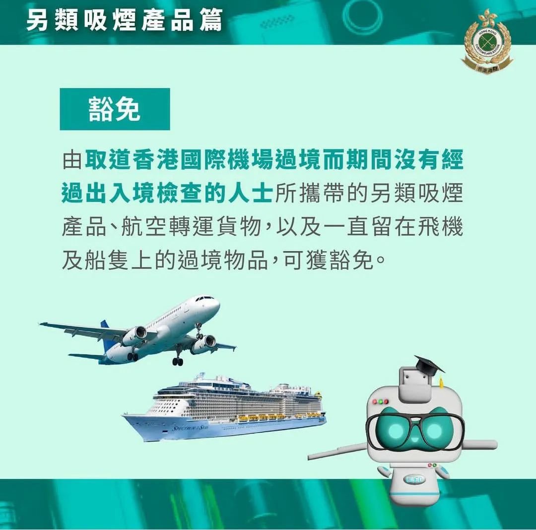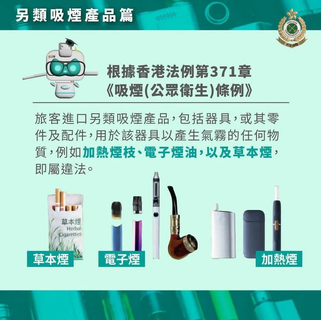 另类吸烟产品,包括器具,或其零件及配件,用于该器具以产生气雾的任何物质,比如电子烟油、草本烟等,都不让带!