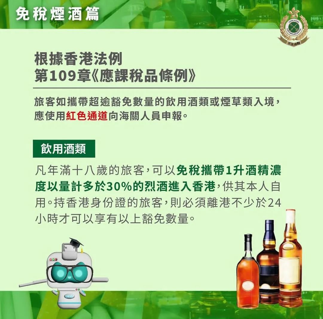 凡年满18岁的旅客,可免税带1升酒精浓度以量计多于30%的烈酒进入香港,供其本人自用。持香港身份的旅客,则必须离港不少于24小时才可以享有以上豁免量。