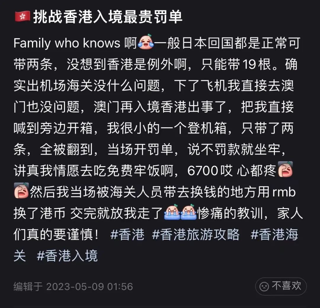 该网友称,据过往经验,从日本回中国均可免税携带2条香烟,而她出发来香港前也曾问朋友,对方均指可以带香烟,她便没有多想,带着2条香烟先到澳门游玩,不料入境香港时却「出事了」。