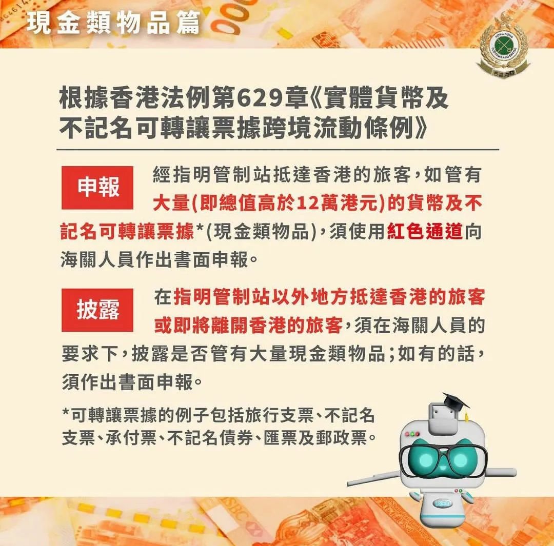 超过12万要申报:经指明管制站抵达香港的旅客,如管有大量货币及不记名可转让票据(现金类物品)(即其总值高于12万港元),须使用红色通道向海关人员作出面书申报。