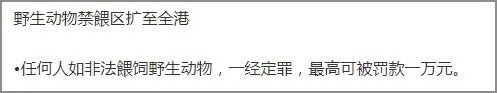 投喂野生动物也会被罚款。根据《条例》,任何人士如在禁喂区非法喂饲野生动物,一经定罪,最高可被罚款1万港元。