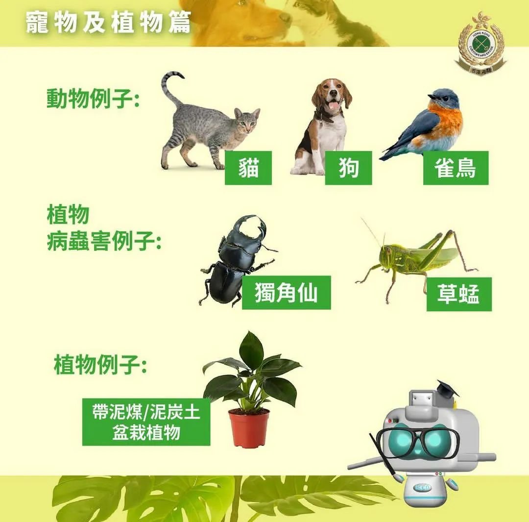 携带动物/植物(获豁免除外)“/植物病虫害以及泥士,必须持有渔农自然护理署预先签发的许可证、牌照、授权书。