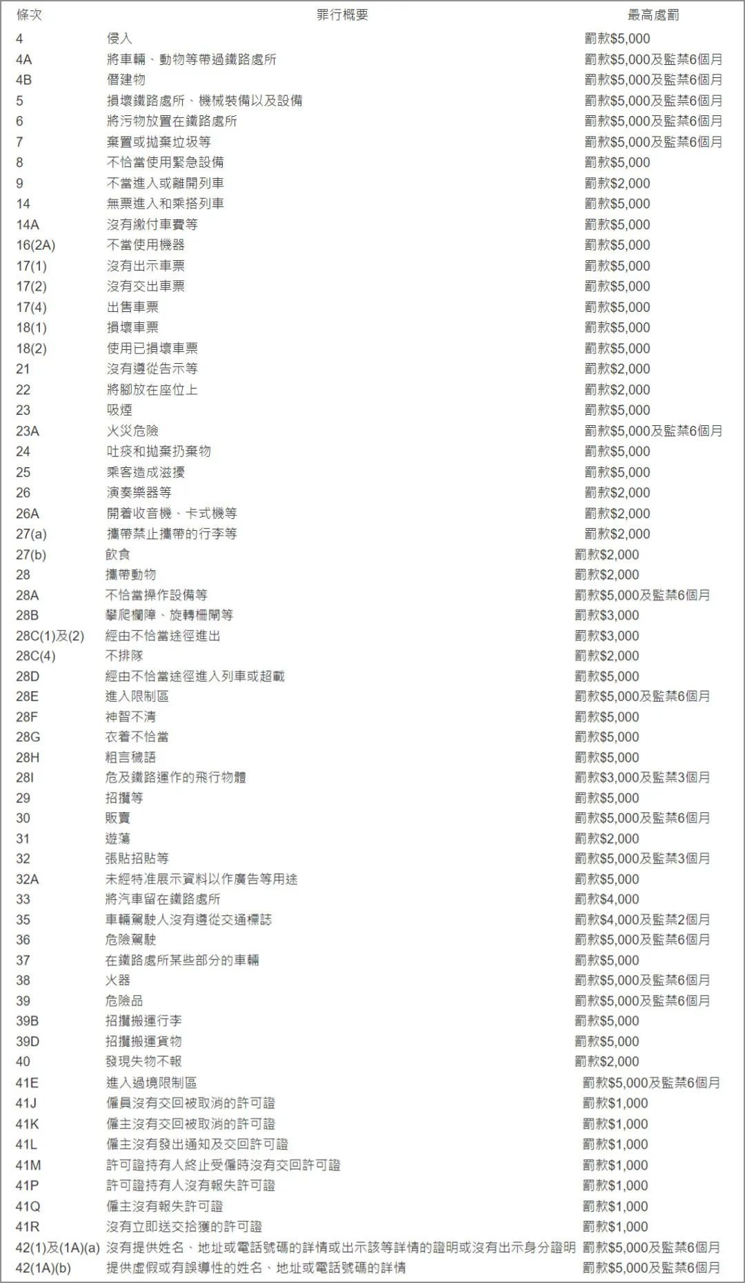 还有很多奇葩罚款项目,比如:放脚在座位上罚款2000港币;神志不清(如醉酒)罚款5000港币;在港铁游荡罚款2000港币…