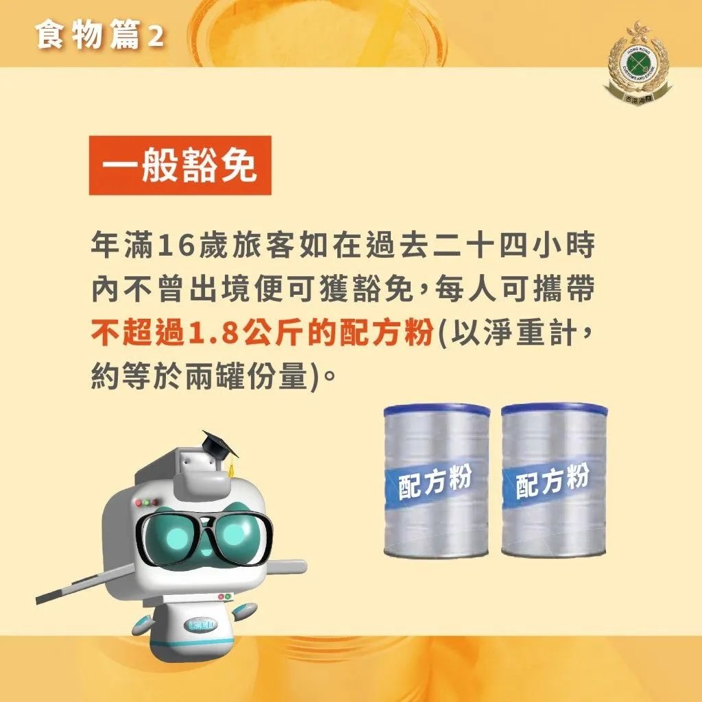 年满16岁旅客如在过去24小时内不曾出境便可获豁免,每人可携带不超过1.8公斤的配方奶(以净重计,约等于两罐份量)。