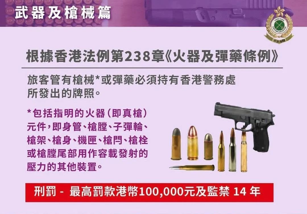 枪械弹药等违规者或获刑罚:最高罚款港币10万元及14年监禁。
