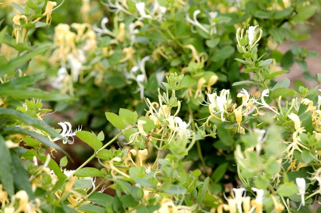 初夏时节,清风徐来,5月11日,在彭泽县黄花镇一大片中药材种植基地,占地上百亩的金银花绿意盎然,村民们正在采摘金银花。
