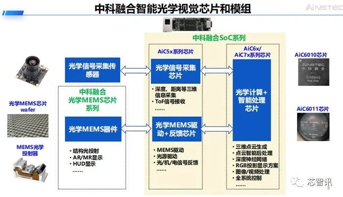 如上图所示,中科融合的光学视觉芯片和模组解决方案当中,光学MEMS器件可以进行结构光投射,光学信号采集传感器可以负责三维信息的采集,光学MEMS驱动+反馈芯片,可以负责MEMS驱动、光源驱动、光机电信号反馈等功能。光学计算+智能处理芯片,则负责三维点云生成、后处理、图像处理的控制。