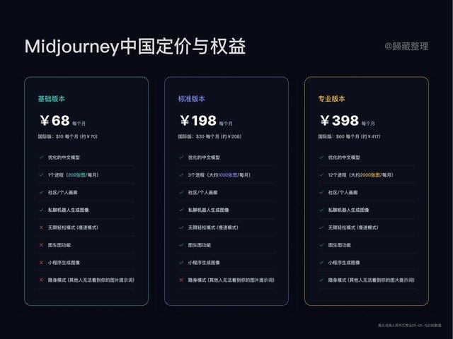 Midjourney分为三档会员,入门68元每月,最贵一档398元每月。