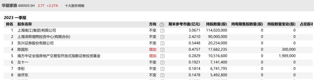 截至今年一季度,华丽家族的前十大股东中有三家机构,除泽熙增煦外还有大股东南江集团和三股东东兴证券,分别持股7.12%和1.26%,另有包括知名牛散徐开东在内的6名自然人和一家基金。董监高中除财务总监王坚忠外无人持股。