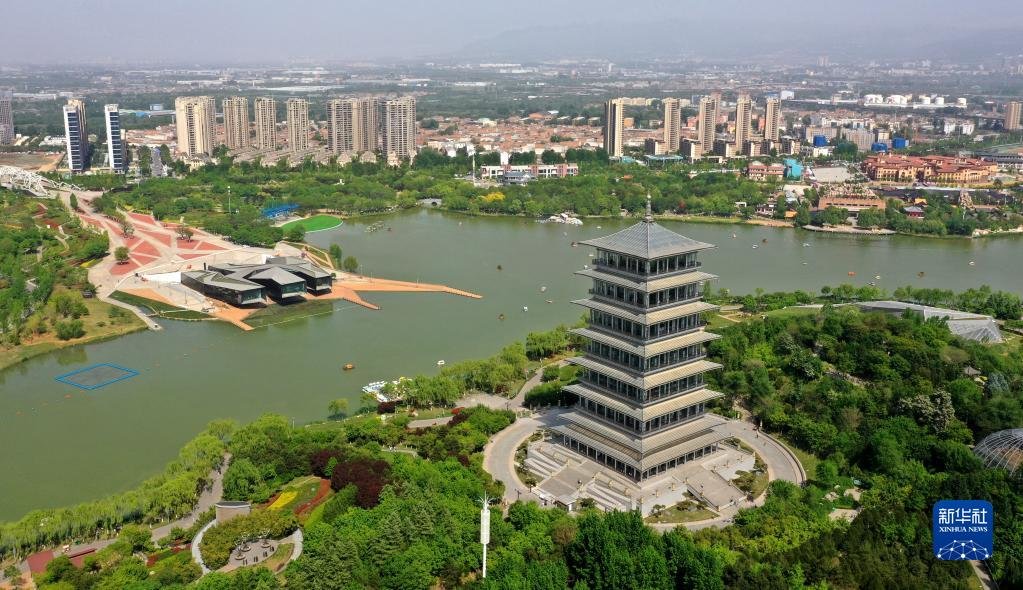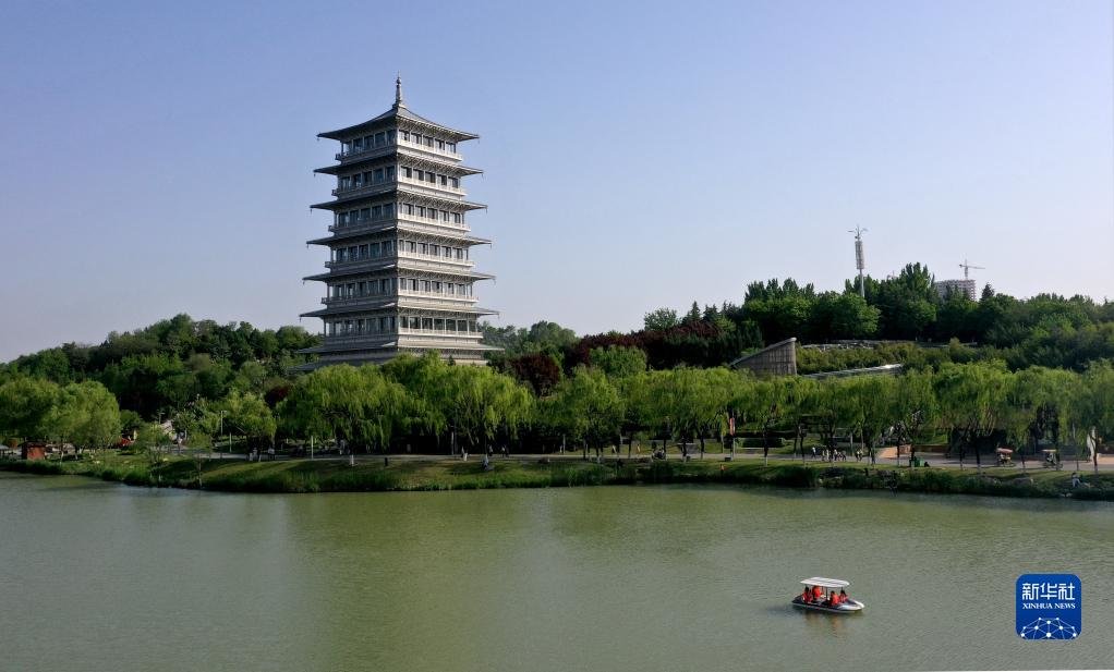 位于西安浐灞生态区的长安塔(4月16日摄,无人机照片)。