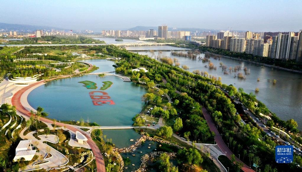 西安浐灞生态区灞河沿岸风光(4月16日摄,无人机照片)。