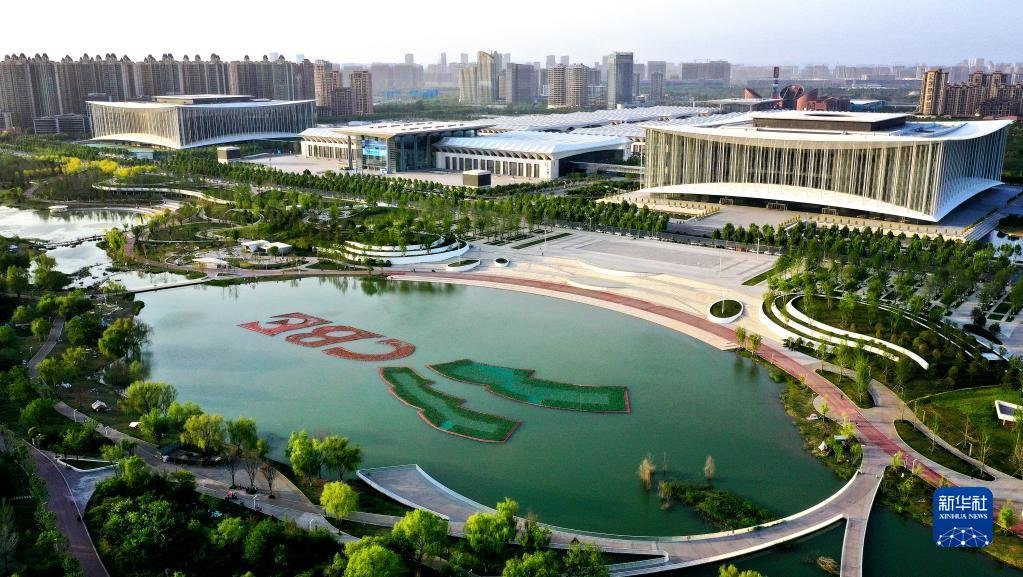 位于西安浐灞生态区的西安国际会展中心(4月26日摄,无人机照片)。