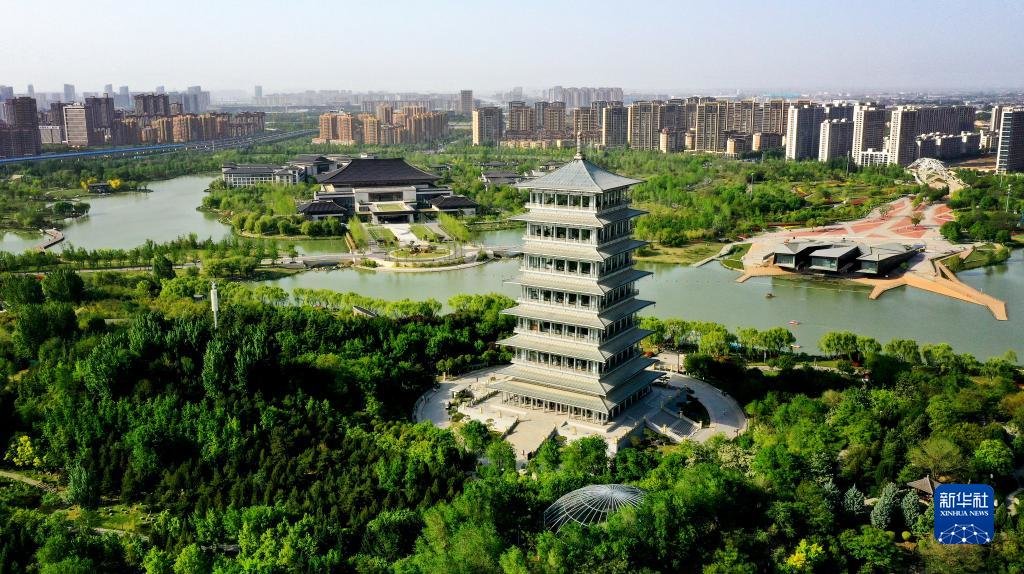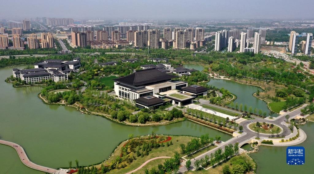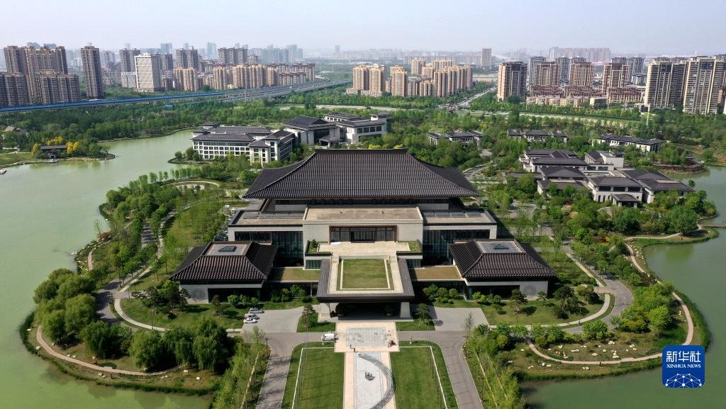 位于西安浐灞生态区的西安国际会议中心(4月16日摄,无人机照片)。