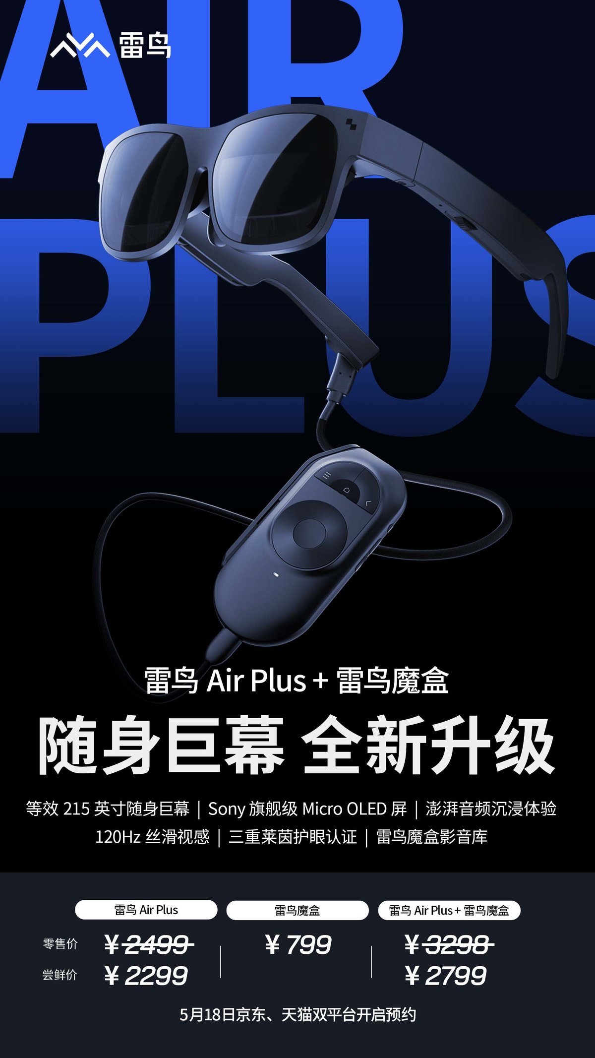 雷鸟Air Plus+魔盒套装定价为3298元,首发尝鲜价2799元。目前也已经在各大平台开启预售。