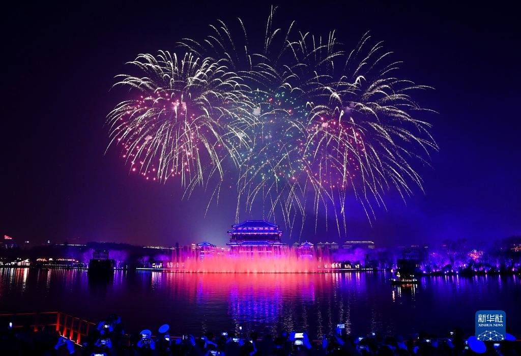 西安大唐芙蓉园2023年元宵节烟花晚会(2月5日摄)。