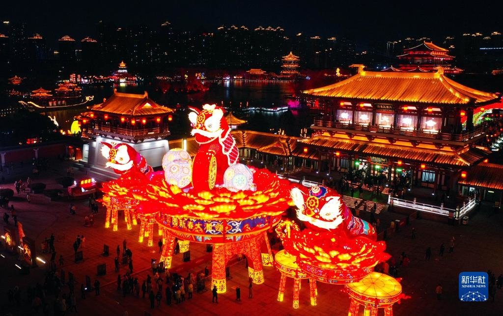 西安大唐芙蓉园2023年“新春大潮会”夜景(1月24日摄,无人机照片)。