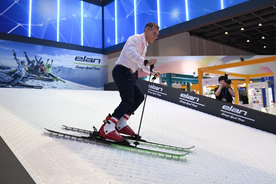专注滑雪设备和器材的斯洛文尼亚伊兰体育集团今年首次参加中国-中东欧国家博览会。该公司带来了滑雪板、滑雪服、头盔等装备,并在展会现场搭建起一座室内滑雪坡,进行产品展示,观众络绎不绝。