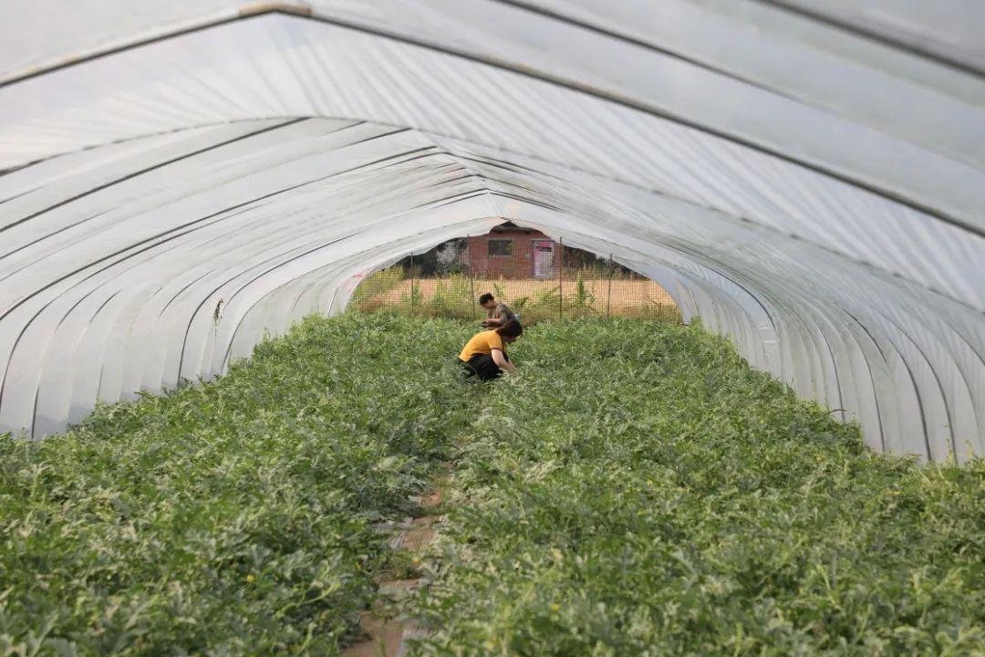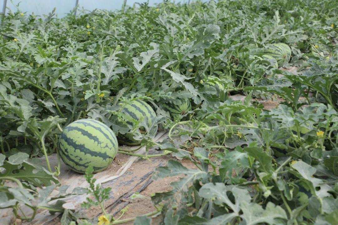 在瓜棚里,青翠欲滴的西瓜藤爬满一地,一个个浑圆饱满的西瓜掩映在藤叶之中,呈现出一派生机盎然的喜人景象。据基地负责人介绍,自2019年返乡,开始种植西瓜,经过几年的摸索,不仅种植技术得到很大提升,种植的面积和瓜棚的数量也在不断增加。截止目前,基地规模有三十多亩,53个标准大棚。
