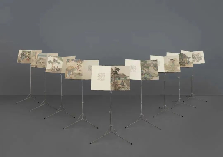 在金属谱架上放置的单幅书画册页,是彭薇从《聊斋》与《西湖拾遗》等古典文学中寻找女鬼的踪影,与浸研文学女鬼形象多年的美国学者蔡九迪(Judith Zeitlin)的谈话而产生的互换写作。这件作品试图探讨绘画和文学中的”幻”和”影”的课题,让观看者以当下的视角再次审视男性叙述中理想化的女性。