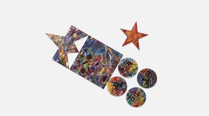 ▲星际采矿:铂族外交,综合材料,由4件直径为100cm的圆形、1件200×200cm方形、1件200×200cm异形与1件直径为150cm的五角星形组成,蒲英玮,2021