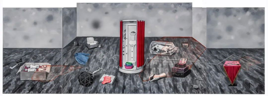 张晓刚作为中国最具影响力的当代画家之一,此次展出的的《舞台4号:淋浴房》将一组看似毫无关联的私人物品组合在一个暧昧的阈限空间中——它们的形象和相互间的关系似乎总处在某种非确定的过渡状态,但又因此摆脱了既定意义的桎梏、向一些依稀未知的方向敞开。张晓刚的艺术始终根植于人的内在体验,并将数代人的历史经验刻写入一种图像寓言,并赋予其真切的情感力量和当下意义。