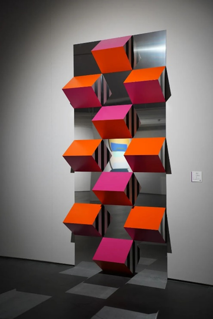 丹尼尔·布伦 (Daniel Buren) 自1960年代起就一直专注创作场域特定作品,他选择原地创作以回应特定地点的属性。布伦的作品常探索深度、表面和空间,《堆积:高浮雕n°B12》由两种铝制方块组合而成,其中一种表面以粉色颜料覆盖,另一种则在经过处理后呈现反光的特质,仿如镜子一样,两组方块共同形成一个独特的立体形态,彰显了艺术家在呈现作品观念意义的同时,也注重刻画物理细节的高超技艺。