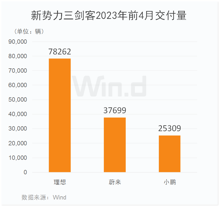 从新势力三剑客当前的销量情况就能明显感受到其中的差异。理想汽车2023年前4个月累计交付量遥遥领先。从新能源车企最新公布的4月份交付量来看,理想汽车前4个月共交付78262辆,蔚来汽车前4个月共交付37699辆,小鹏汽车前4个月共交付25309辆,理想交付量超过蔚来+小鹏之和,呈现出大幅领先的态势。