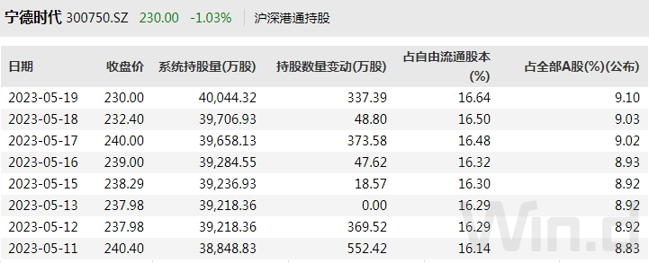 Wind统计显示,北向资金5月19日净买入宁德时代337.39万股,5月11日以来,累计净买入1747.9万股,累计净买入额超40亿元。