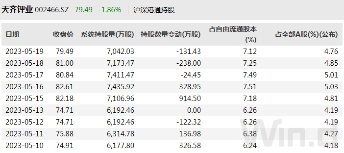 此外,同样加仓了天齐锂业,Wind统计显示,北向资金5月10日以来净买入天齐锂业1190.91万股,累计净买入额约8亿元。