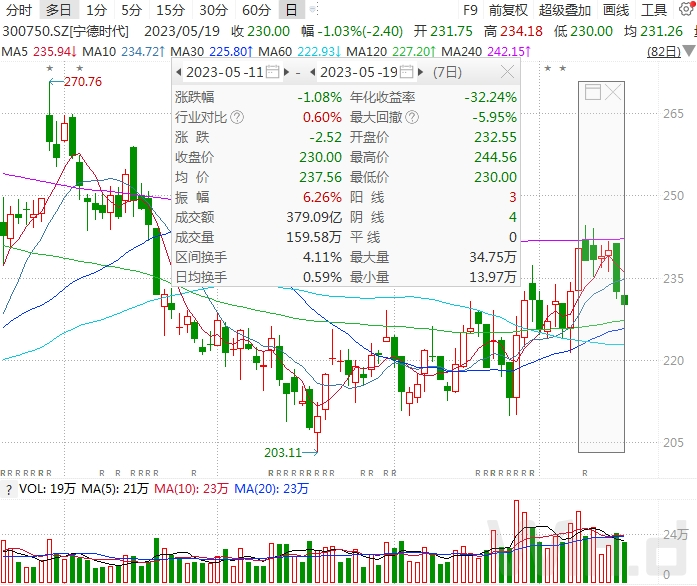 从宁德时代近期走势来看,5月11日-19日,公司股价累计下跌1.08%,北上资金的大举加仓并未得到市场响应。