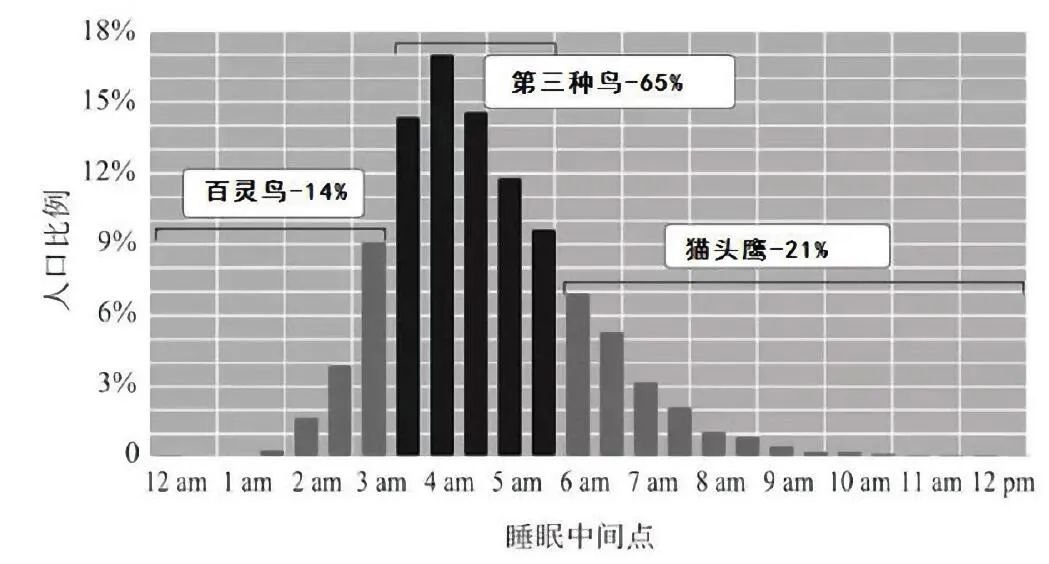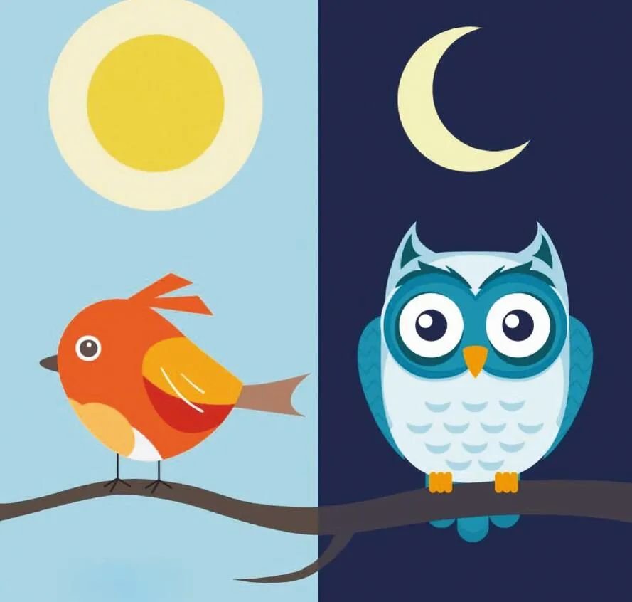 发现了吗?有很大的可能我们既不是百灵鸟也不是猫头鹰,而是介于两者之间的“第三种鸟”。因为百灵鸟和猫头鹰是极其典型的两种昼夜节律,对大多数人而言可能很难成为“典型”,但我们可以根据自己的实际状况判断我们更偏向于哪种类型。