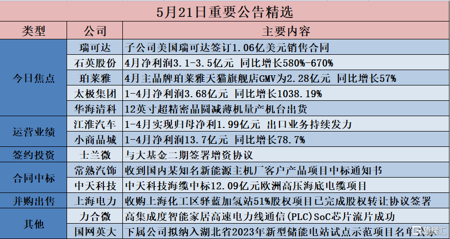 石英股份(603688.SH)发布公告,2023年4月,受益于下游半导体、光伏等行业快速增长的需求拉动,公司经营业绩实现较快增长,主要产品盈利水平明显优于同期,各业务板块高效经营,取得了良好的业绩成果。经公司初步核算,2023年4月,公司实现营业收入约4.8-5.3亿元,同比增长约320%-370%;实现归属于上市公司股东的净利润约3.1-3.5亿元,同比增长约580%-670%。