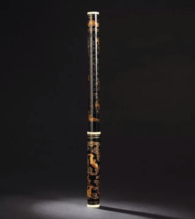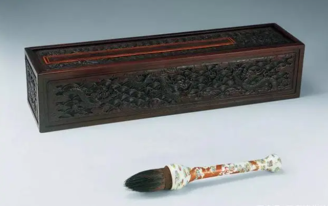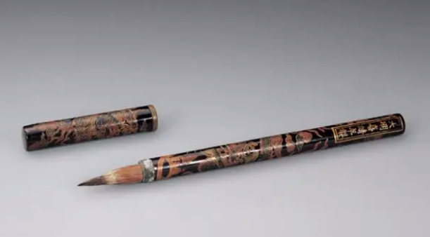 2006年11月22日,中国嘉德2006秋季拍卖会,明嘉靖黑漆彩绘龙纹毛笔,长22cm,成交价:人民币352,000元。