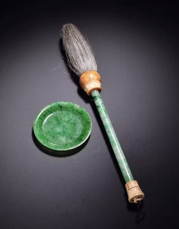 2013年10月7日,保利香港2013年秋季拍卖会,清末翡翠毛笔、小碟(两件),刷子长34cm;盘子直径8.5cm,成交价:港币805,000元。