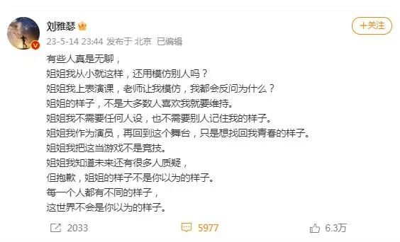 5月14日,刘雅瑟亲发微博怼人,说“有些人真是无聊”。然后一通扫射,扫射那些说她模仿李斯丹妮,嘲她立人设表现油腻,质疑她在乎输赢的“人”——看得出来刘姐很生气,一口气用了8个“姐姐”自称,霸气侧漏。