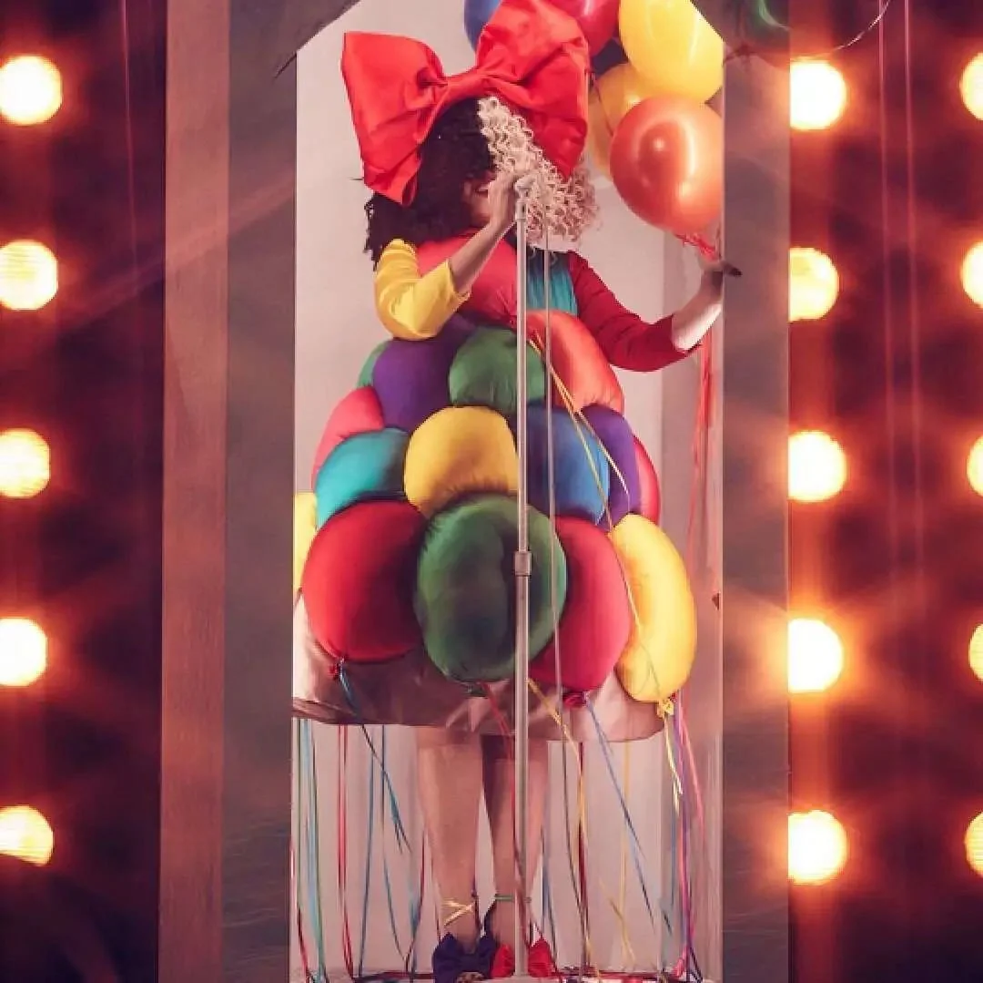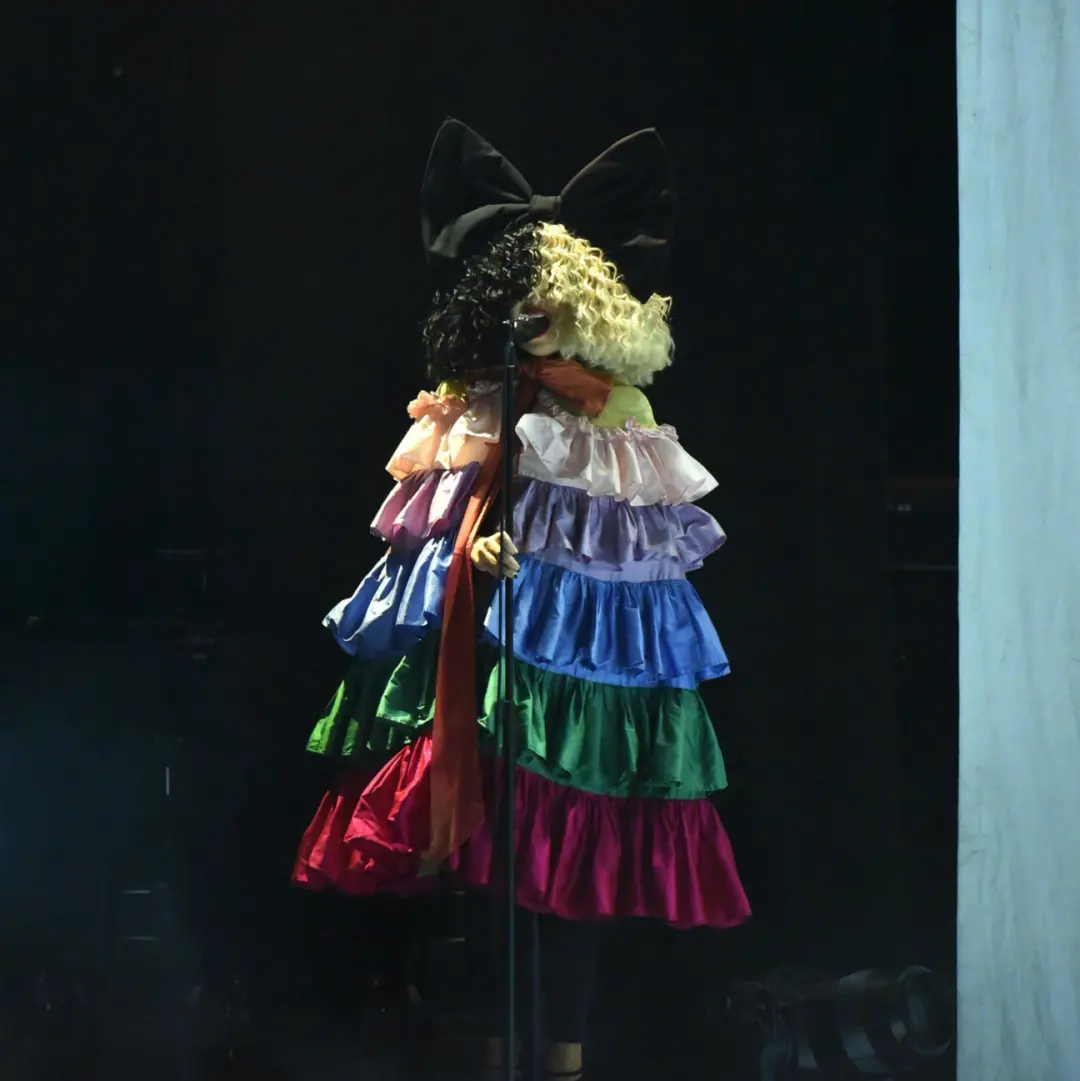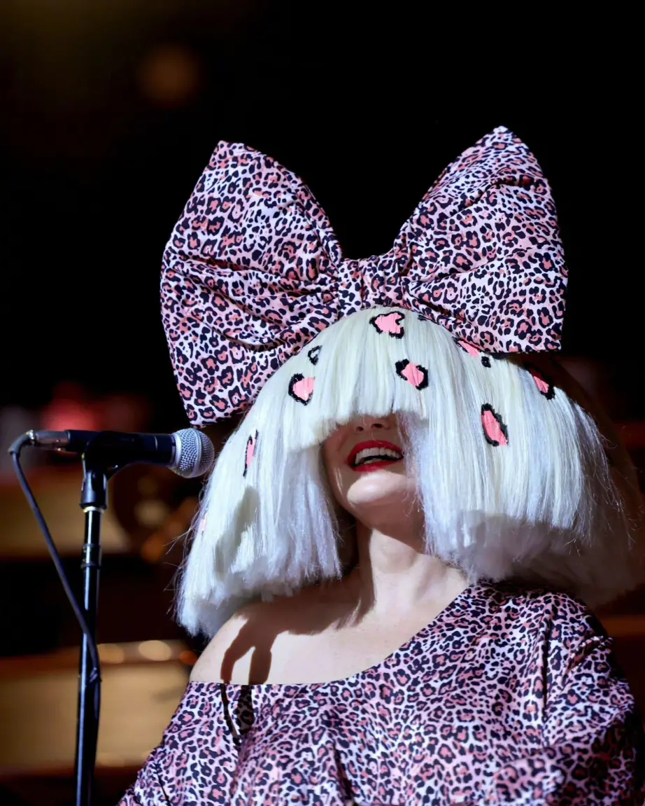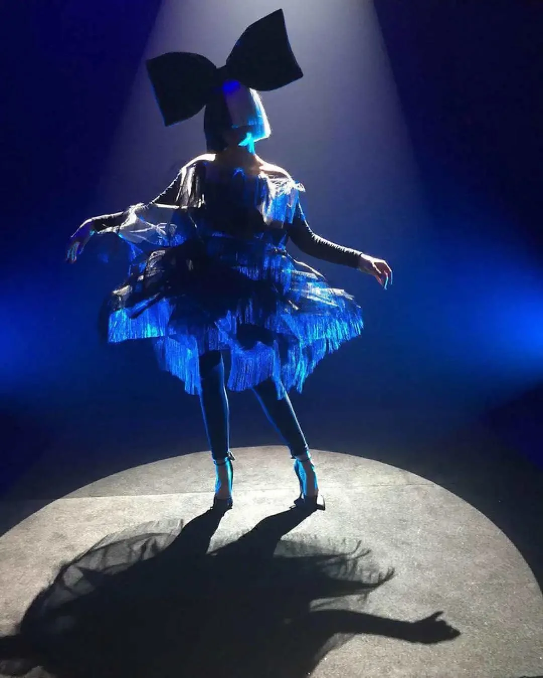 一顶夸张的足以盖住大部分面容的黑白假发,一只大大的蝴蝶结,永远站在舞台上一个靠边的角落,是Sia每次在表演时的固定组合,以隐藏她的真实面容。