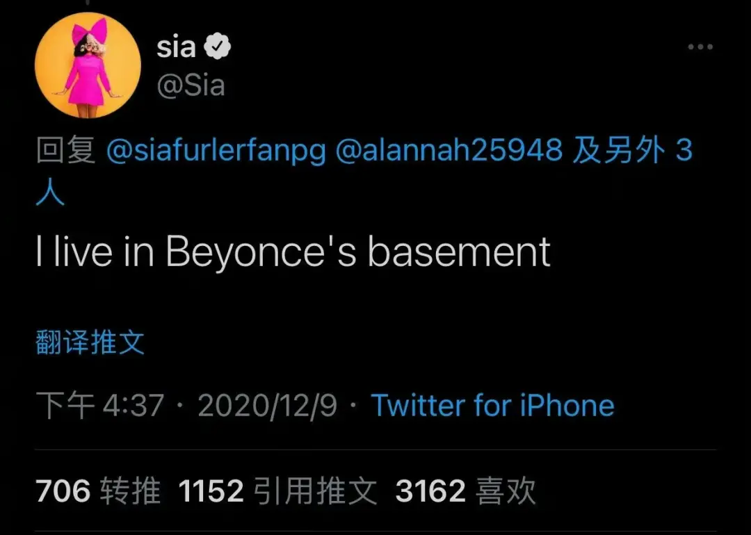 有趣的是,后来Sia在2020年的推文里还回复了这个梗。当时有网友评论Sia:“你觉得自己在推特很有话语权吗?我打赌你就是个住在地下室的人,唯一让你觉得自己有价值的事就是当个键盘侠。”Sia亲自玩梗回复到,“我住在Beyonce的地下室”,于是传言就这样被“证实”了。欧美Diva们人均喜剧人无疑。