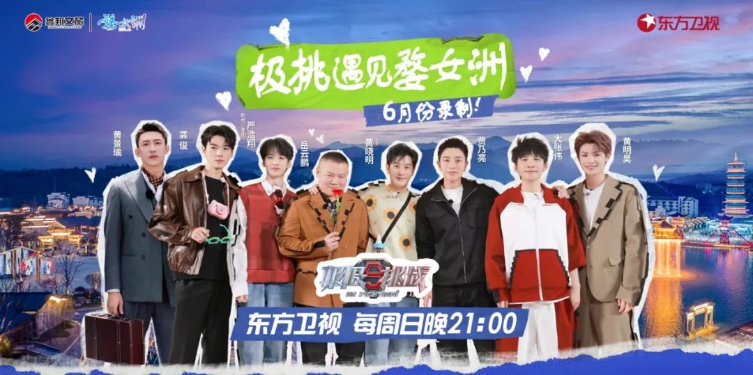 6月11日-6月12日,东方卫视励志体验节目《极限挑战》第九季,大张伟、龚俊、黄景瑜、黄明昊、黄晓明、贾乃亮、时代少年团严浩翔、岳云鹏组成的“极挑团”又将在婺女洲热血启程,传递治愈力量,向未知发起挑战!