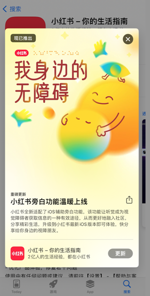 站长之家5月22日 消息:为了帮助视障用户更好地使用和融入小红书社区,该平台于今年5月初在iOS端的更新版中适配了苹果系统的“旁白”辅助功能。
