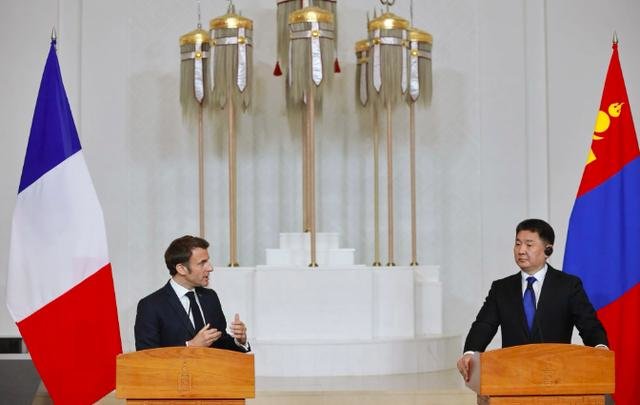 据路透社报道,在参加完于日本广岛举行的G7峰会之后,马克龙在返回法国的途中短暂访问蒙古国,于21日抵达蒙古国首都乌兰巴托,并受到了传统蒙古仪式欢迎。马克龙与蒙古国总统呼日勒苏赫在国际局势、地缘政治、气候变化、防治荒漠化等全球性议题,以及能源合作、文化、教育、农业等领域进行了深入讨论。两国鼓励在政治框架内的交流,同意在联合国和其他国际组织的合作框架内定期举行协商会。