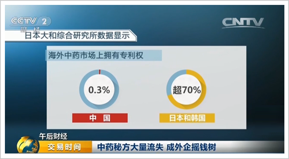 在海外市场上,日本和韩国拥有70%以上中药专利,中国仅占0.3%!