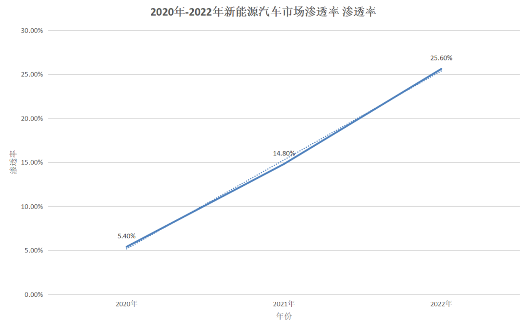 2020年,中国新能源汽车销量为138万辆,同比增长11.4%,渗透率约为5.8%,低于路线图1.0的预期。然而,2022年中国新能源汽车销量达到了688.7万辆,同比增长高达93.4%,渗透率高达25.6%。