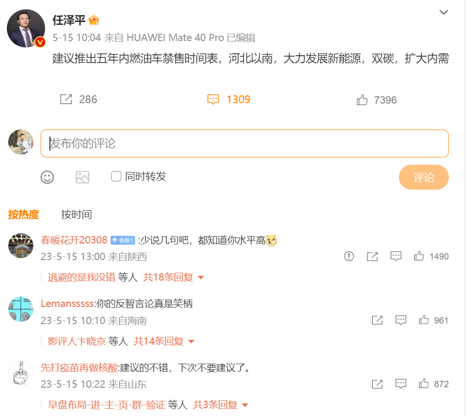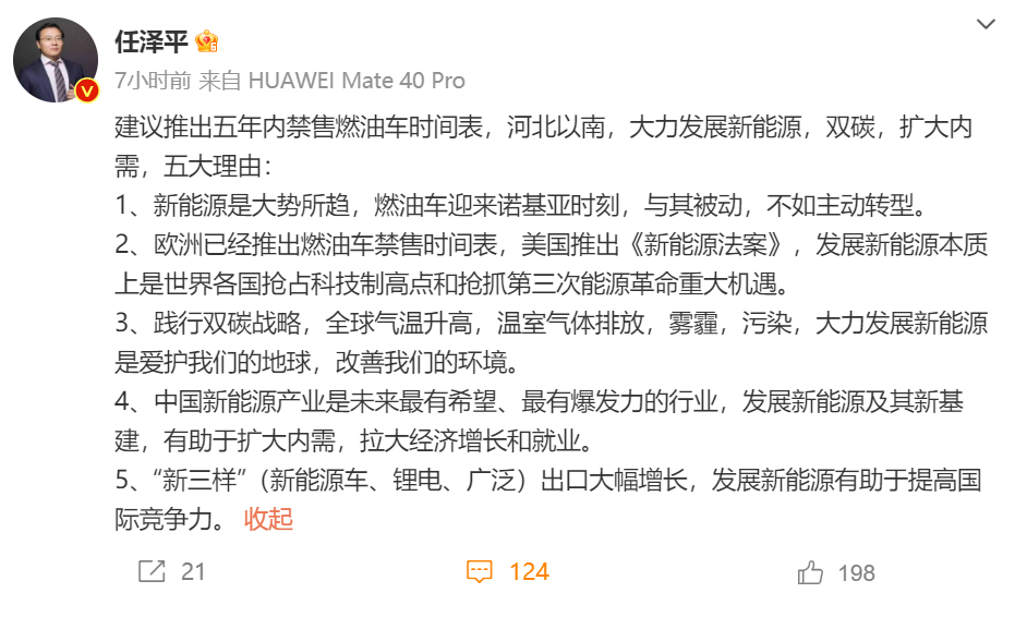 我国著名经济学家任泽平前几天在社交媒体发文称,建议推出5年内燃油车禁售时间表,河北以南大力发展新能源,双碳,扩大内需。对于这位经济学“专家”的这番言论,教授并不认可。