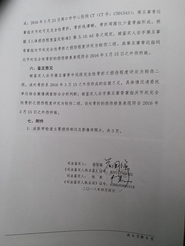 后,商水县公安局委托湖北崇新对被害人损伤程度进行鉴定,该鉴定中心结合相关材料、病历及影像学资料,临床专家会诊和人体检验所见,鉴定意见为吴某某右手第五掌骨中远段完全性骨折程度评定为轻伤二级,该处骨折系2016年3月15日之外伤形成的依据不足;被鉴定人右手第五掌骨掌指关节处完全性骨折之损伤程度评定为轻伤二级,该处骨折的损伤修复表现符合2016年3月15日之外伤所致。二审时,湖北崇新鉴定人屈某强出庭接受询问并当庭对所作的鉴定意见进行说明,明确表示被害人吴某某右手第五掌骨有两处损伤,其中右手第五掌骨掌指关节处完全性骨折之损伤程度为轻伤二级,修复表现符合2016年3月15日之外伤所致。