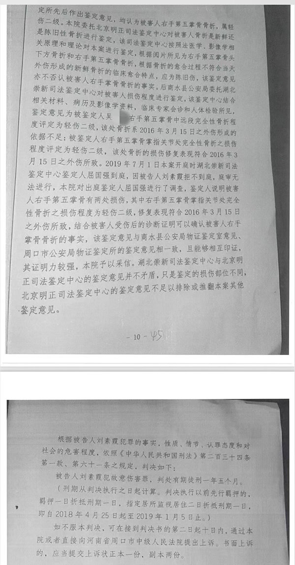 澎湃新闻注意到,2021年12月13日,商水县法院对此案作出判决:刘素霞犯故意伤害罪,判处有期徒刑一年五个月。这与该院2018年11月作出的刑事判决一致。