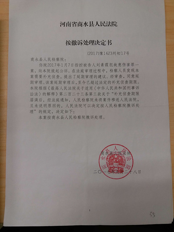 2017年7月,经法院批准,刘素霞再次被取保候审。同年9月,商水县法院出具《按撤诉处理决定书》称,在法庭审理过程中,检察人员发现本案需要补充侦查,提出了延期审理的建议。经审查,同意延期审理。该案延期审理后,至今已超过法定的补充侦查期限。案件按商水县检察院撤诉处理。