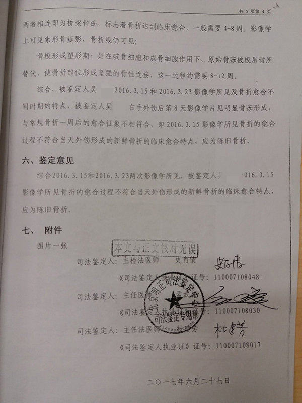 在法院审理此案中,“新伤”还是“旧伤”成为争议焦点。为此,商水县法院委托北京明正对吴某某的伤情进行鉴定。2017年6月27日,该鉴定中心出具的鉴定意见显示,综合2016年3月15日和2016年3月23日两次影像学所见,吴某某2016年3月15日影像学所见骨折的愈合过程不符合当天外伤形成的新鲜骨折的临床愈合特点,应为陈旧骨伤。