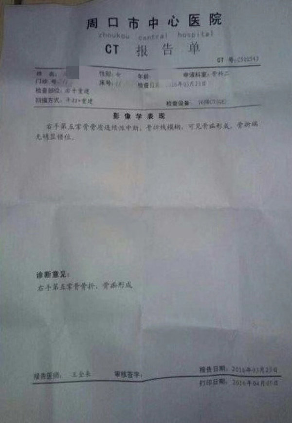 2018年,此案有了新的变化。同年4月,受商水县公安局委托,湖北崇新出具鉴定报告:吴某某右手第五掌骨中远段完全性骨折之损伤程度评定为轻伤二级,该处骨折系2016年3月15日之外伤形成的依据不足,具体情况请委托单位结合案情调查综合分析判断;吴某某第五掌骨掌指关节处完全性骨折之损伤程度评定为轻伤二级,该处骨折的损伤修复表现符合2016年3月15日之外伤所致。