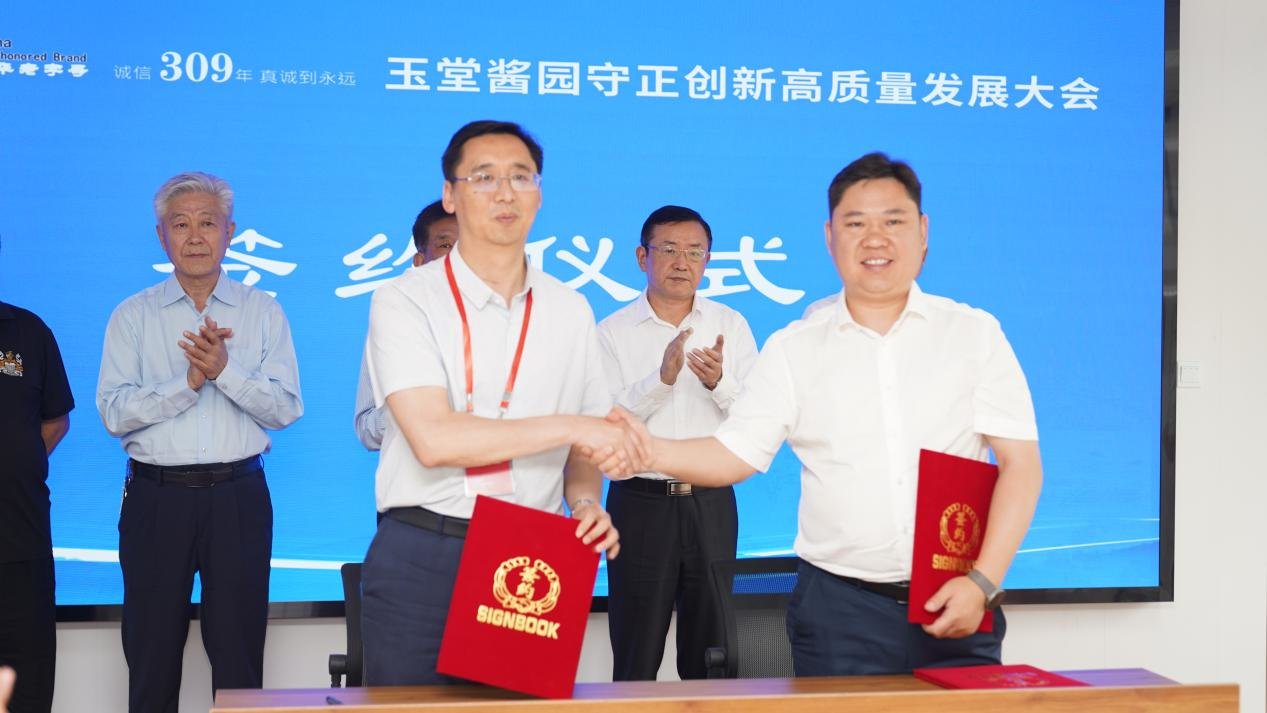 济宁市烹饪餐饮业协会会长曹会宇与玉堂酱园总经理常贵东签约